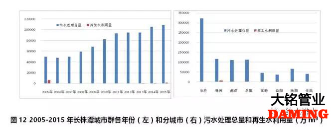 長(zhǎng)株潭城市群2005-2015年期間,污水處理總量持續(xù)增加,2015年污水處理總量達(dá)到10億m³,是2005年的2.2倍。2002-2008年期間廢水排放總量基本與經(jīng)濟(jì)增長(zhǎng)水平保持同步遞增趨勢(shì),且廢水排放生產(chǎn)率快速提高,總體環(huán)境污染負(fù)荷較高。盡管長(zhǎng)株潭城市群2005年至2010年期間工業(yè)廢水排放達(dá)標(biāo)率持續(xù)改善,但區(qū)域上中下游城市污水集中處理率分別為15.3%、31.8%、49.4%,水污染問(wèn)題嚴(yán)重。2009年是長(zhǎng)株潭城市群污水處理量提升的一個(gè)關(guān)鍵年份,2009年以后污水處理量大幅度提升,這可以有效改善區(qū)域生態(tài)環(huán)境資源承載能力。但再生水利用量沒(méi)有同比例增加,其用量?jī)H為污水處理總量的1.2%(見(jiàn)圖12左)。除長(zhǎng)沙和株洲外,湘潭、岳陽(yáng)、常德、益陽(yáng)、衡陽(yáng)和婁底這六個(gè)城市均無(wú)再生水生產(chǎn)和利用行為(見(jiàn)圖12右)。研究表明,長(zhǎng)株潭城市群2030年城市化率達(dá)到90%、第二產(chǎn)業(yè)和第三產(chǎn)業(yè)持續(xù)增長(zhǎng)的態(tài)勢(shì)下,只有將污水處理率提高到100%、污水回用率提高到35%的條件下,才不會(huì)產(chǎn)生水資源供需缺口狀況[7]。提升城市群再生水利用率是實(shí)現(xiàn)水資源供需平衡的一個(gè)重要措施。