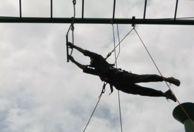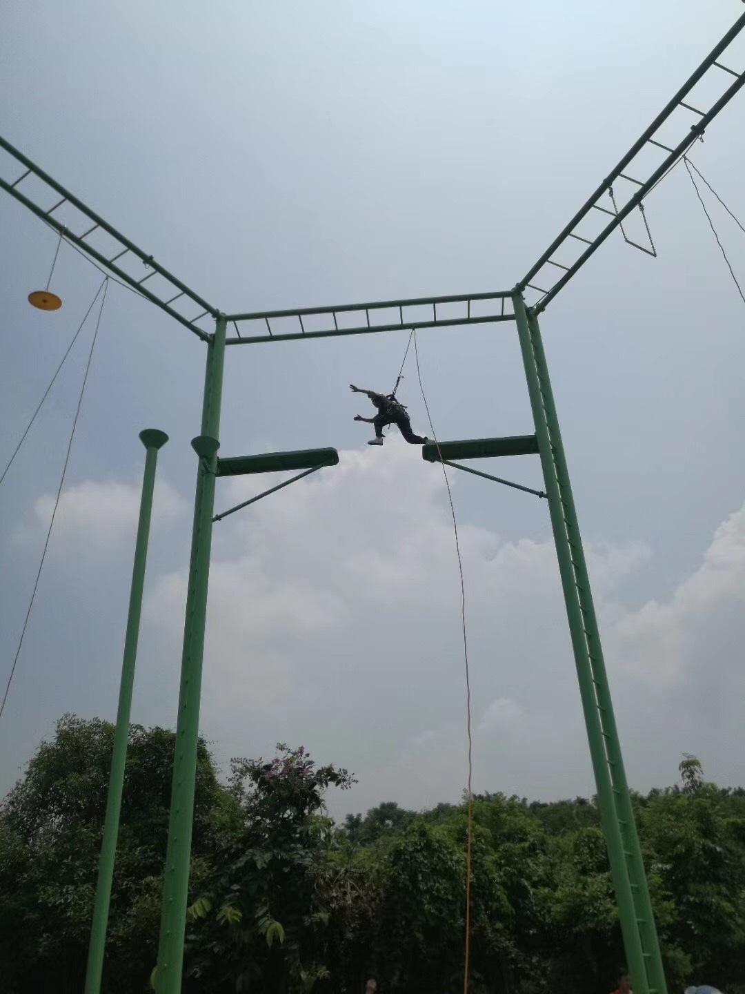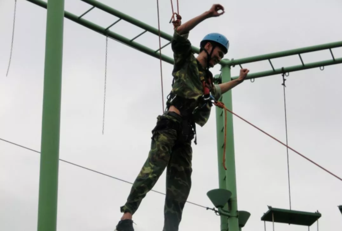 空中單杠是一項自我挑戰(zhàn)的高空高難度項目,隊員需要在9米高臺,直徑25公分的圓臺上站立,奮力跳躍抓住空中的單杠。挑戰(zhàn)自我,客服心理障礙,培養(yǎng)自信心。面對機遇,能果斷把握,增強自我決斷的能力,以積極冷靜的心態(tài)去爭取。樹立對困難、對問題不懼不卻以及挑戰(zhàn)的魄力。